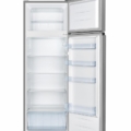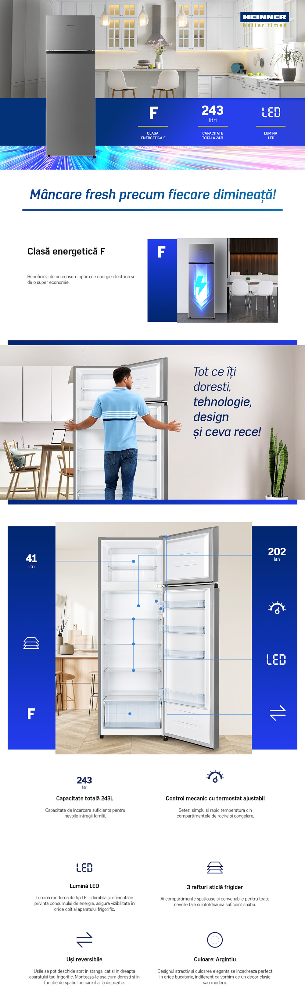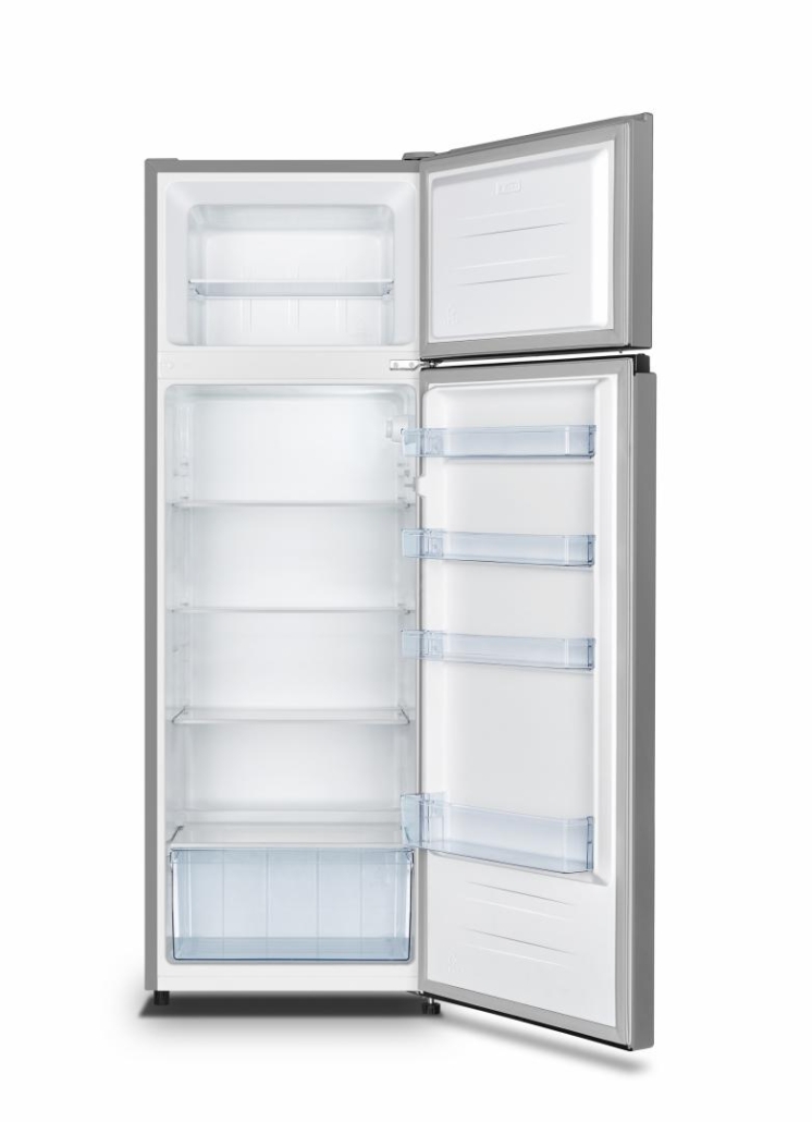 Double door refrigerator Heinner HF-HS243SF+, energy efficiency class F, total capacity: 243L, fridge capacity: 202L, freezer capacity: 41L, mechanical control with adjustable thermostat, LED light, 3 fridge glass shelves, crisper drawer, reversible doors, egg tray, ice cube tray, freezing capacity: 2 kg/24h, dimensions(WxDxH): 55 x 54.2 x 161 cm, color: silver with black handle