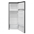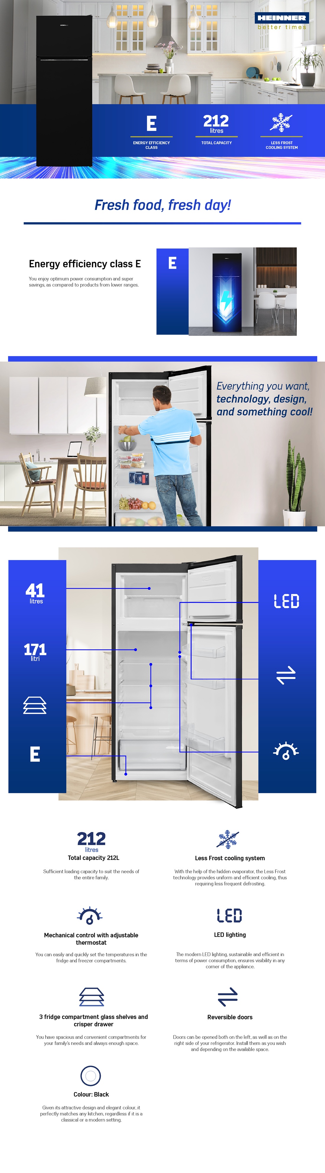 Double door refrigerator Heinner HF-V212BKE++, energy efficiency class: E, Less Frost cooling system, total capacity: 212L, fridge capacity: 171L, freezer capacity: 41L, mechanical control with adjustable thermostat, LED light, 3 fridge glass shelves, 1 compartment for fruits and vegetables, reversible doors, egg tray, ice cube tray, freezing capacity: 2.6Kg/24h, dimensions (W x D x H): 54 x 57 x 145 cm, color: Black