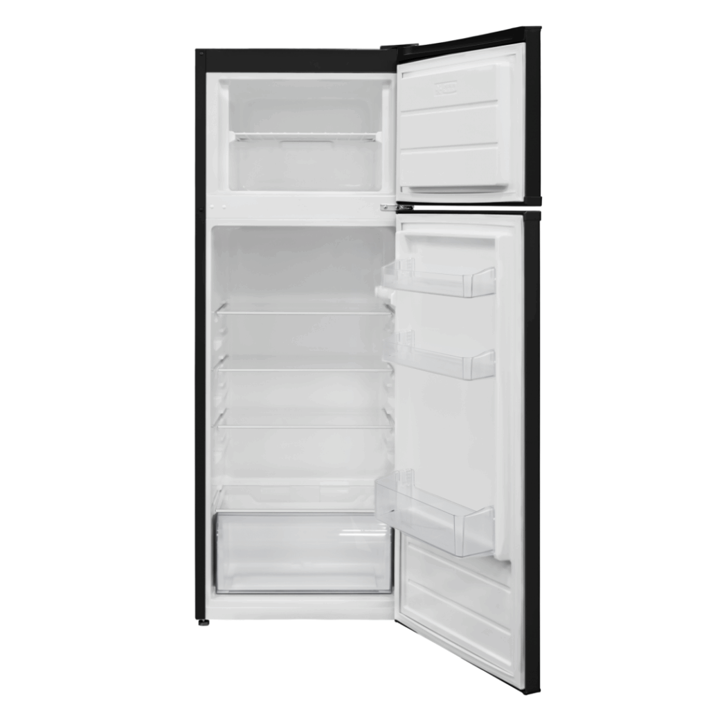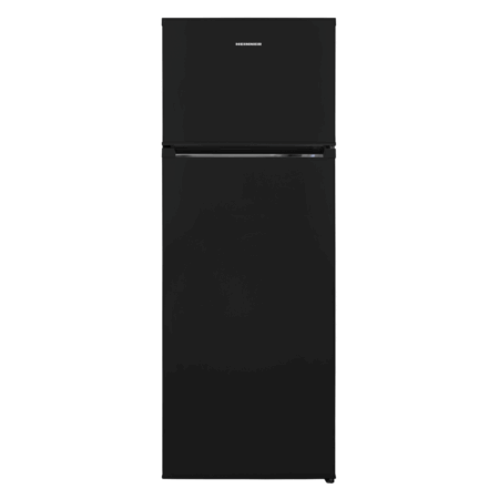 Double door refrigerator Heinner HF-V213BKF+, Energy efficiency class: F, Less Frost cooling system, Total capacity: 212L, Fridge capacity: 171L, Freezer capacity: 41L, Mechanical control with adjustable thermostat, LED light, 3 fridge glass shelves, 1 compartment for fruits and vegetables, Egg tray, Ice cube tray, Freezing capacity: 2.6Kg/24h, Dimensions (W x D x H): 54 x 57 x 144 cm, Color: Black