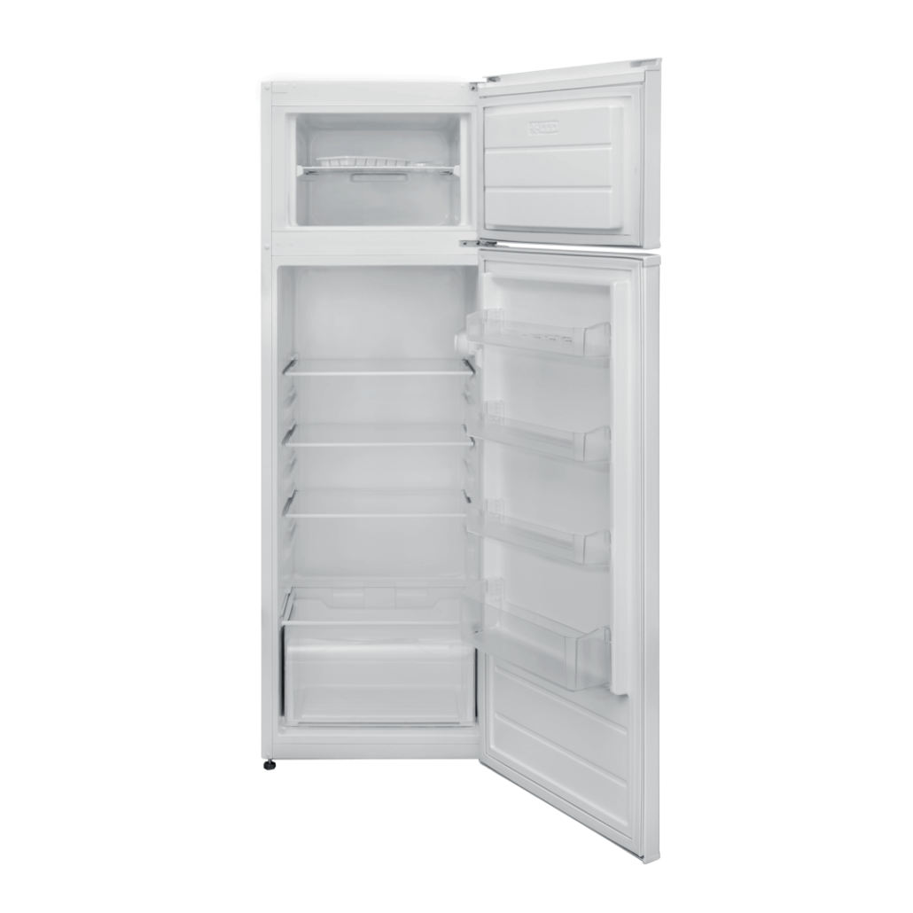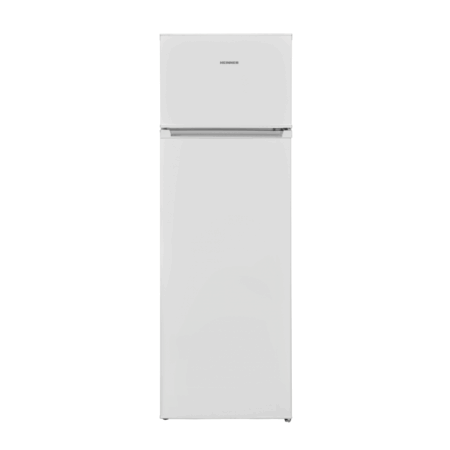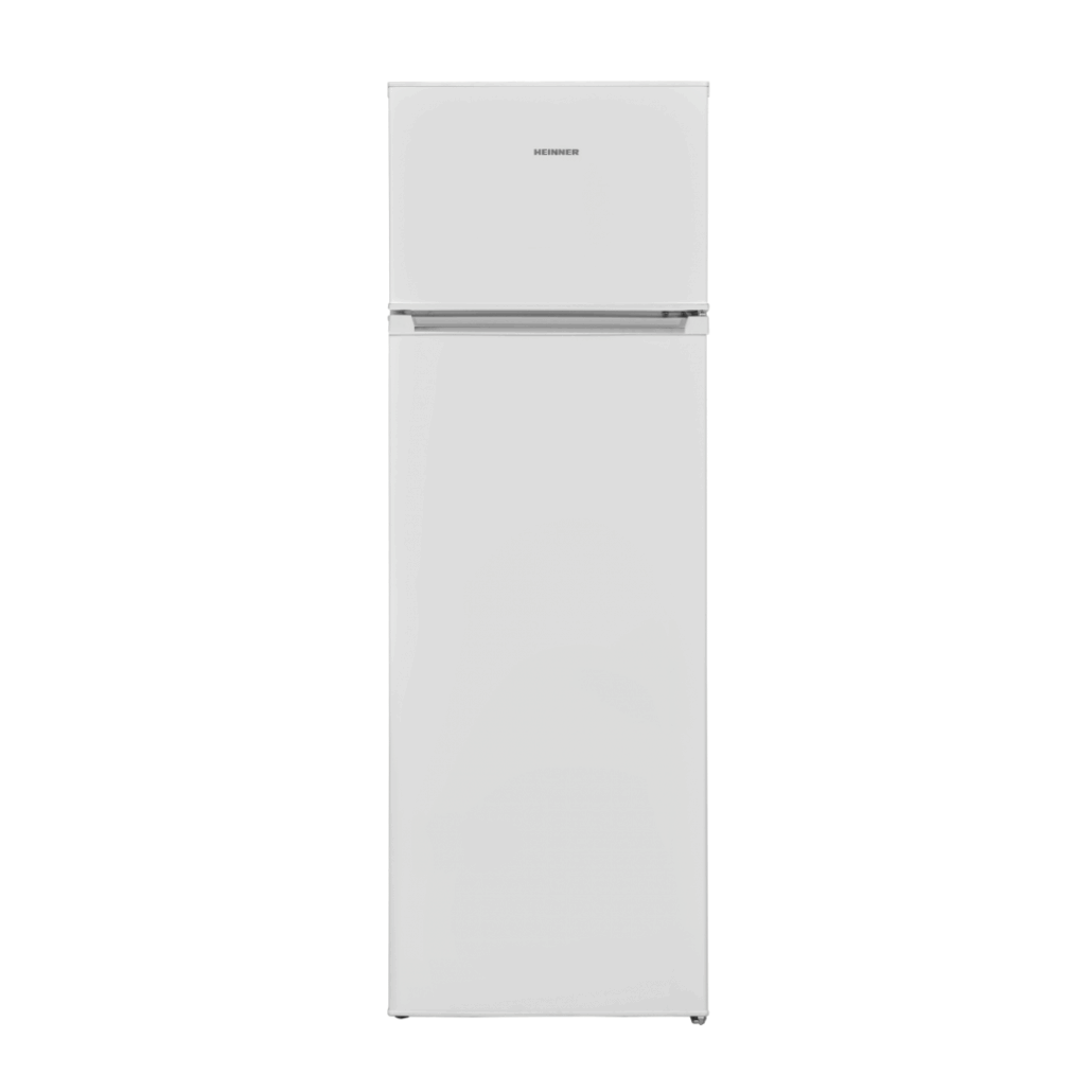 Double door refrigerator Heinner HF-V240F+, Energy efficiency class: F, Less frost cooling system, Total capacity: 242L, Fridge capacity: 201L, Freezer capacity: 41L, Mechanical control with adjustable thermostat, LED light, 3 fridge glass shelves, Compartment for fruits and vegetables, Reversible doors, Egg tray, Ice cube tray, Freezing capacity: 2.6kg/24h, Dimensions (WxDxH): 54 x 57 x 160 cm, Color: White with silver strip decoration on handle
