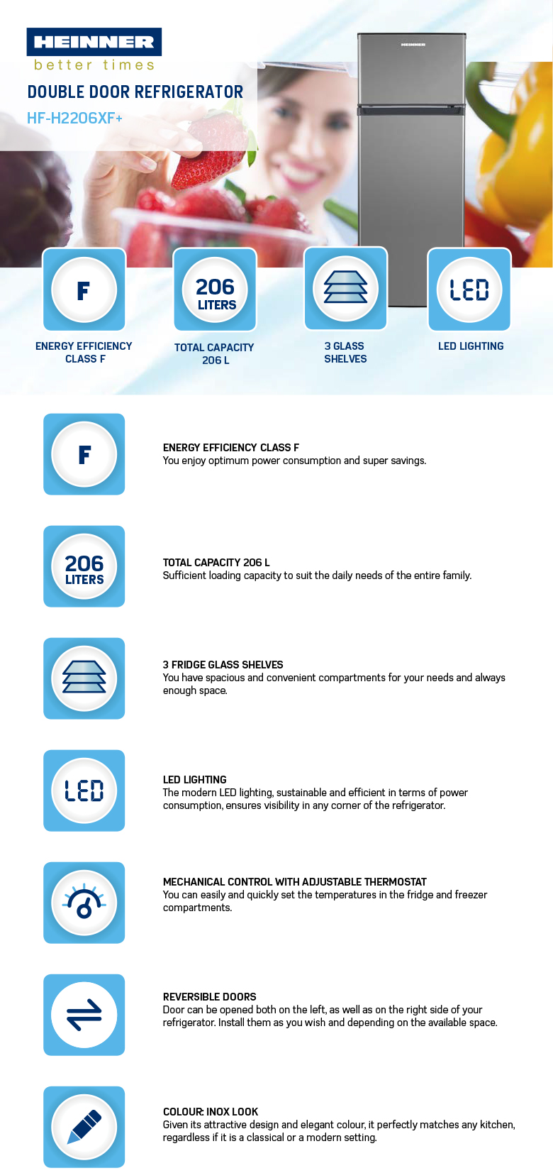 Double door refrigerator Heinner HF-H2206XF+, Energy efficiency class: F, Total capacity: 206L, Fridge capacity: 169L, Freezer capacity: 37L, Mechanical control with adjustable thermostat, LED light, 3 fridge glass shelves, 1 compartment for fruits and vegetables, Reversible doors, Egg tray, Freezing capacity: 2.4kg/24h, Dimensions (WxDxH): 54.5 x 55.5 x 143 cm, Colour: Inox Look