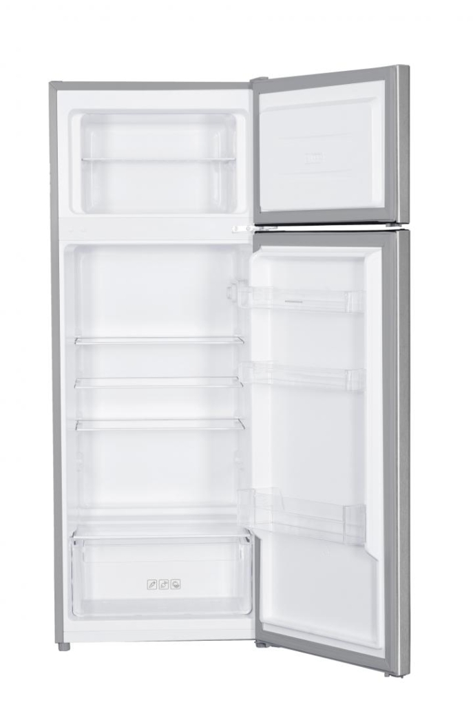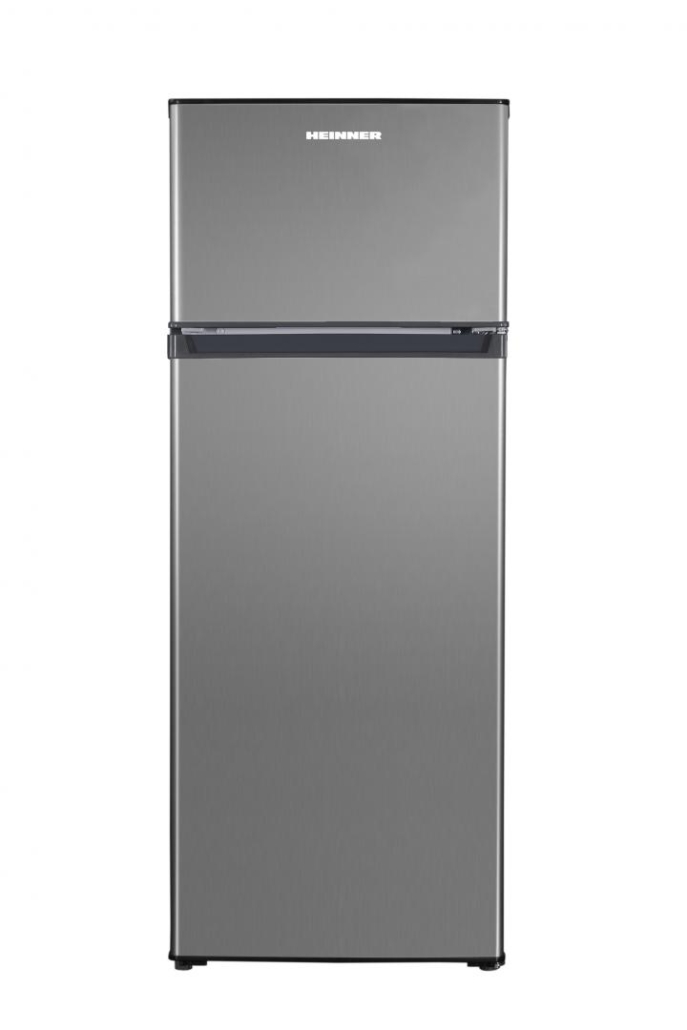 Double door refrigerator Heinner HF-H2206XF+, Energy efficiency class: F, Total capacity: 206L, Fridge capacity: 169L, Freezer capacity: 37L, Mechanical control with adjustable thermostat, LED light, 3 fridge glass shelves, 1 compartment for fruits and vegetables, Reversible doors, Egg tray, Freezing capacity: 2.4kg/24h, Dimensions (WxDxH): 54.5 x 55.5 x 143 cm, Colour: Inox Look