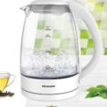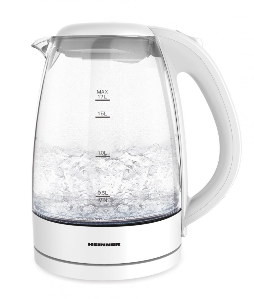 Electric kettle Heinner Chaude HEK-2200GWH, 1.7L capacity, detachable filter, heat plate with LED indicator, boil-dry protection, automatic shutdown, cord storage, anti-slip feet, glass body, power: 1850-2200W, white