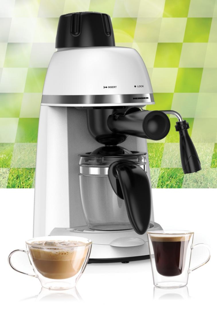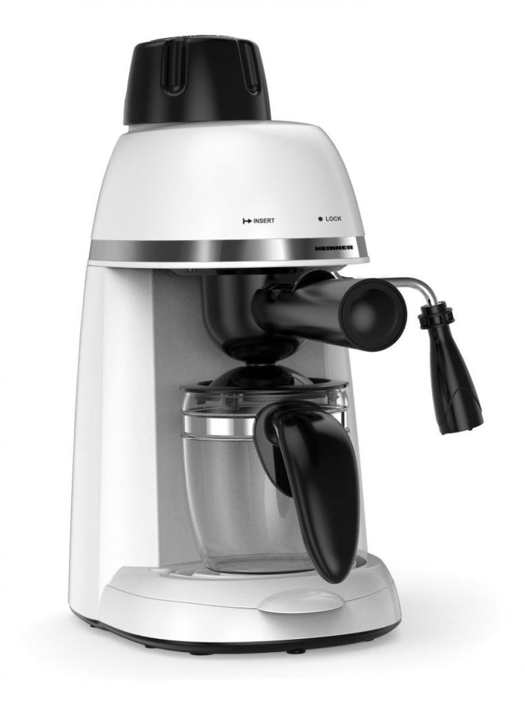 Espresso maker Heinner Kopy HEM-350WH, 800W, 3.5 bar pressure pump, water tank capacity: 240 ml, beverage options: espresso and cappuccino, stainless steel filter, aluminum aloy boiler, glass carafe, color: white