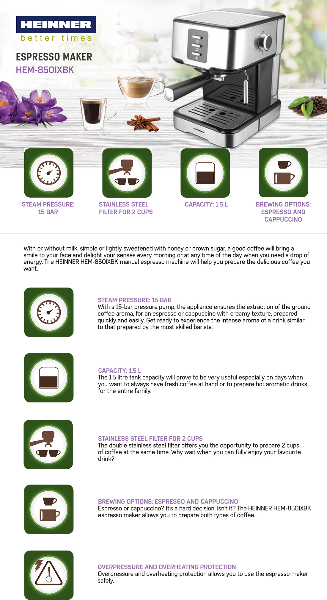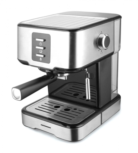 Espresso maker Heinner Brasillo HEM-850IXBK, 850W, 15 bar pressure pump, detachable water tank capacity: 1.5l, 2 cups dual-stainless steel filter, die-cast aluminum alloy boiler, high pressure frothing function, overpressure and overheating protection, stainless steel, color: silver