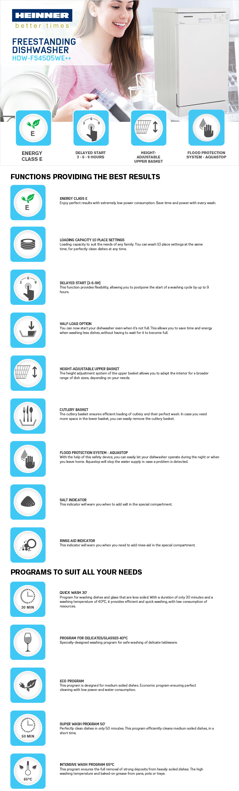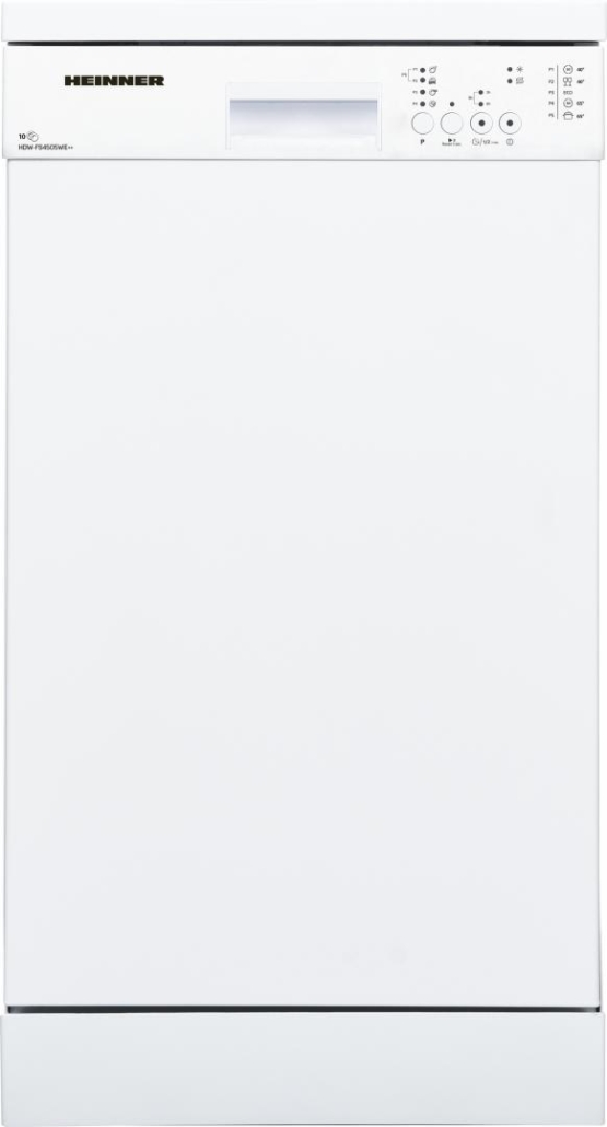Freestanding dishwasher Heinner HDW-FS4505WE++, 10 place settings, Energy efficiency class E, Electronic control, 5 washing programs, Fast program 30’, Delicate program, Intensive program, ECO program, Half load option, Delay timer option (3-6-9H), Adjustable upper basket (when it’s empty), Protection against water damage - Aquastop, Dimensions (IxLxA): 85 x 44.8 x 59.8 cm, Colour: White
