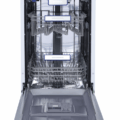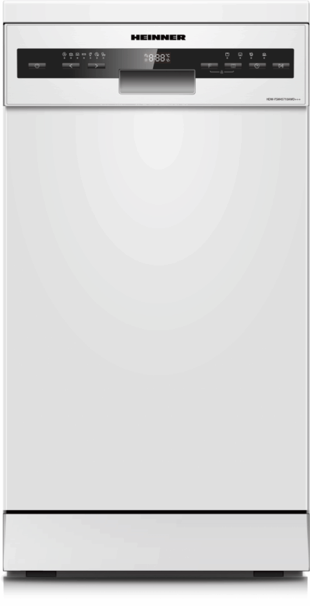 Dishwasher Heinner HDW-FSM45710AWD+++, 10 place settings, energy efficiency class D, Auto door opening, electronic control, LED display, 7 washing programs, Rapid program 30’, Auto Smart program: 55°C - 65°C, 90 min. program, Intensive program: 65°C, delay timer option (1-24H), half load option - Dual zone, Extra cleaning function, Extra drying function, 3 baskets – upper cutlery basket, Flexible space - Adjustable upper basket (loaded), lower basket: 2 foldable plate supports, Child lock, protection against water damage – Aquastop, water consumption: 8.5L/washing cycle, dimensions (WxDxH): : 45 x 60 x 85 cm, color: White