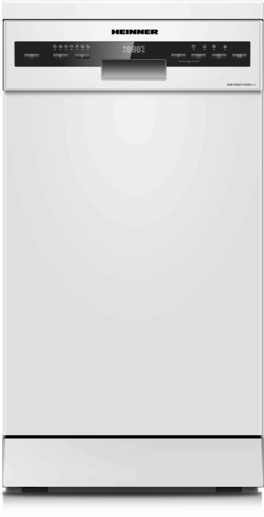 Dishwasher Heinner HDW-FSM45710AWD+++, 10 place settings, energy efficiency class D, Auto door opening, electronic control, LED display, 7 washing programs, Rapid program 30’, Auto Smart program: 55°C - 65°C, 90 min. program, Intensive program: 65°C, delay timer option (1-24H), half load option - Dual zone, Extra cleaning function, Extra drying function, 3 baskets – upper cutlery basket, Flexible space - Adjustable upper basket (loaded), lower basket: 2 foldable plate supports, Child lock, protection against water damage – Aquastop, water consumption: 8.5L/washing cycle, dimensions (WxDxH): : 45 x 60 x 85 cm, color: White