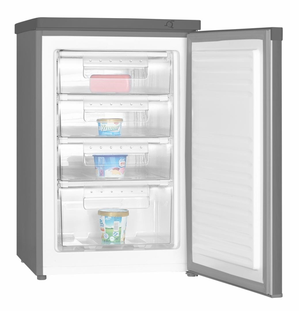Freezer Heinner HFF-91HSF+, energy efficiency class: F, total capacity: 91L, mechanical control with adjustable thermostat, 4 freezer compartments, reversible door, freezing capacity: 4.4kg/24h, dimensions (WxDxH): 55 x 58 x 85 cm, color: Silver