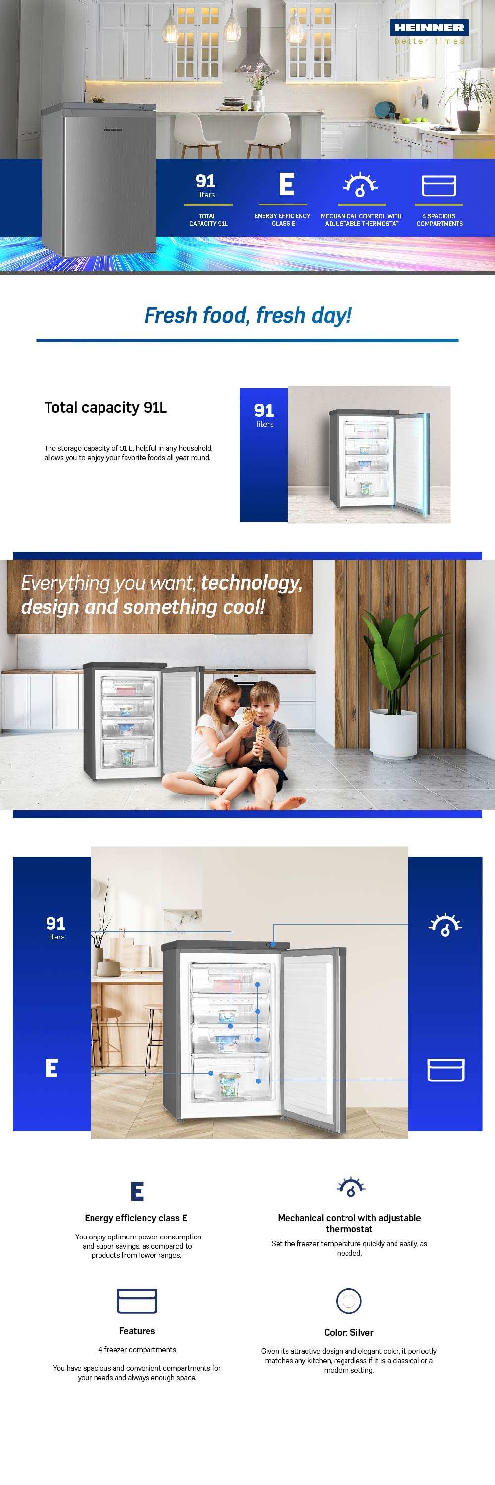 Freezer Heinner HFF-HM91SE++, energy efficiency class: E, total capacity: 91L, mechanical control with adjustable thermostat, 4 compartments, manual defrosting, reversible door, freezing capacity: 4.4 kg/24h, dimensions: 55 x 58 x 85 cm, color: Silver