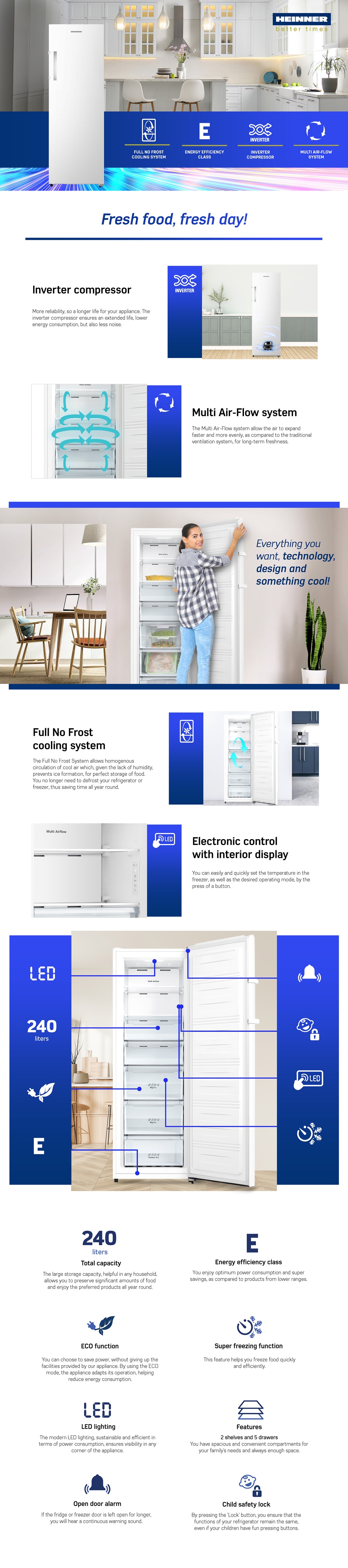 Freezer Heinner HFF-HS240NFE++, Full No Frost, Multi Air Flow system, energy efficiency class: E, total capacity: 240 L, electronic control with digital display, Super freezing function, ECO function, 7 freezer compartments: 5 drawers + 2 glass shelves compartments, LED light, open door alarm, reversible door, ice cube tray, freezing capacity: 10.8 kg/24h, dimensions (WxDxH): 59.5 x 59 x 172 cm, color: White
