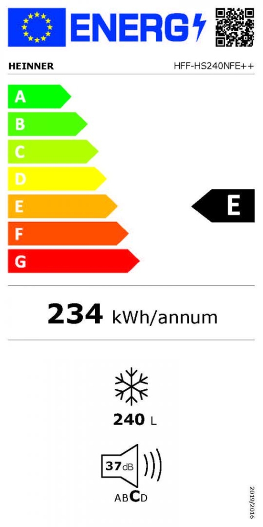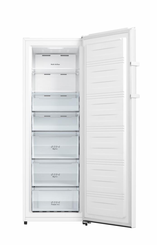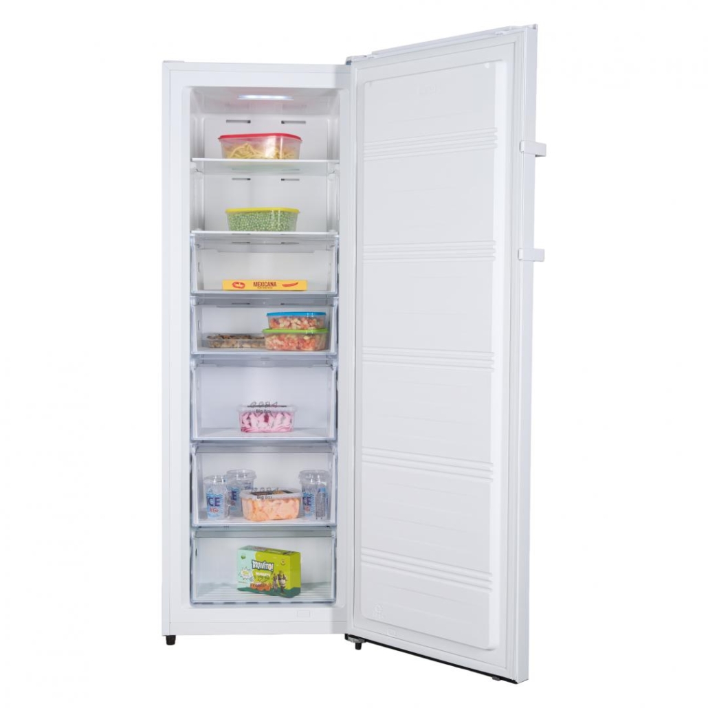 Freezer Heinner HFF-HS240NFE++, Full No Frost, Multi Air Flow system, energy efficiency class: E, total capacity: 240 L, electronic control with digital display, Super freezing function, ECO function, 7 freezer compartments: 5 drawers + 2 glass shelves compartments, LED light, open door alarm, reversible door, ice cube tray, freezing capacity: 10.8 kg/24h, dimensions (WxDxH): 59.5 x 59 x 172 cm, color: White
