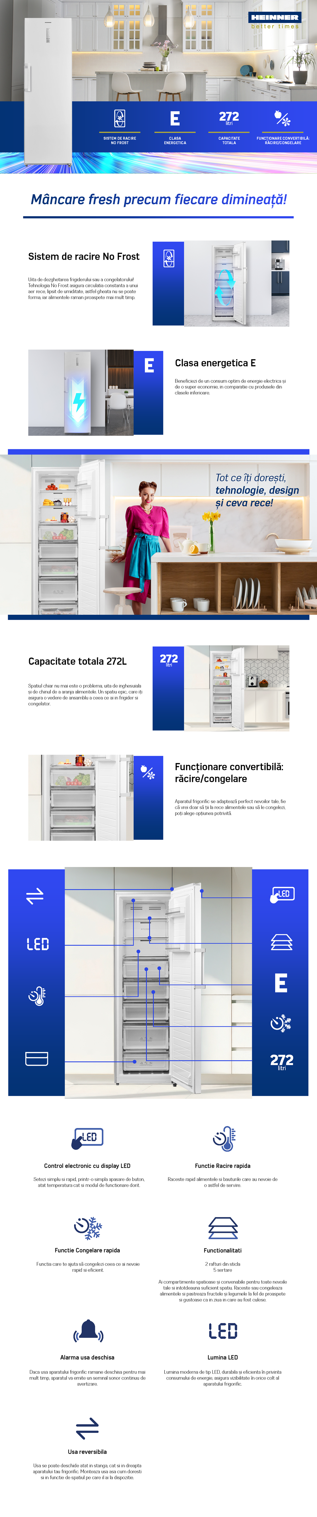 Freezer Heinner HFF-M272NFCE++, No Frost, Cool & Freeze – Convertible Fridge/Freezer, energy efficiency class: E, total capacity: 272L, LED display, electronic control, Super cooling function, Super freezing function, LED light, reversible door, 2 glass shelves, 5 drawers, open door alarm, freezing capacity: 12.4kg/24h, dimensions (WxDxH): 59.5 x 61.8 x 185 cm, colour: White