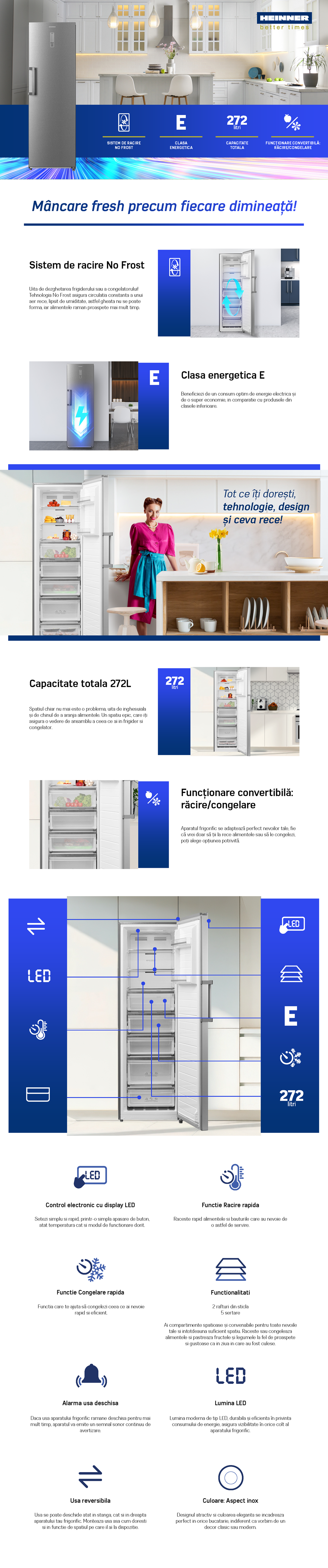 Freezer Heinner HFF-M272NFCXE++, No Frost, Cool & Freeze – Convertible Fridge/Freezer, energy efficiency class: E, total capacity: 272L, LED display, electronic control, Super cooling function, Super freezing function, LED light, reversible door, 2 glass shelves, 5 drawers, open door alarm, freezing capacity: 12.4kg/24h, dimensions (WxDxH): 59.5 x 61.8 x 185 cm, colour: Inox look