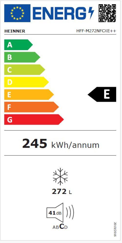 Freezer Heinner HFF-M272NFCXE++, No Frost, Cool & Freeze – Convertible Fridge/Freezer, energy efficiency class: E, total capacity: 272L, LED display, electronic control, Super cooling function, Super freezing function, LED light, reversible door, 2 glass shelves, 5 drawers, open door alarm, freezing capacity: 12.4kg/24h, dimensions (WxDxH): 59.5 x 61.8 x 185 cm, colour: Inox look
