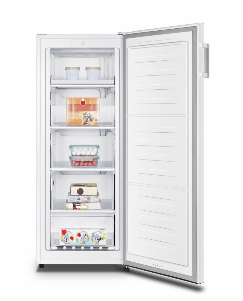 Freezer Heinner HFF-N165F+, Energy efficiency class: F, Total capacity: 165L, Mechanical control with adjustable thermostat, 5 freezer compartments, Reversible door, Freezing capacity: 7.6kg/24h, Dimensions (WxDxH): 55 × 58.8 × 143.4 cm, Colour: White