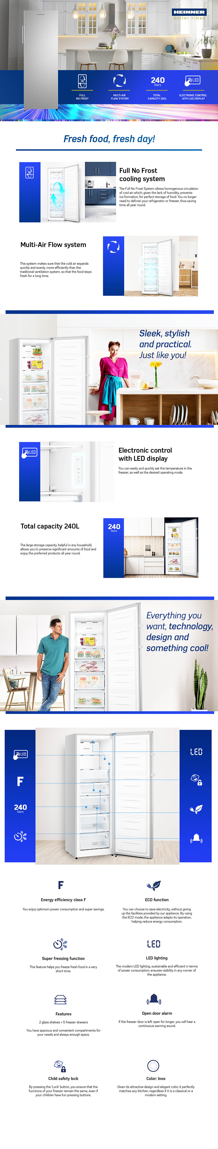 Freezer Heinner HFF-N240NFXF+, Full No Frost, energy efficiency class: F, total capacity: 240L, Multi-air flow system, Internal display - LED, super freezing function, ECO function, open door alarm, 7 freezer compartments: 5 drawers + 2 glass shelves, freezing capacity: 10.8kg/24h, dimensions (WxDxH): 59.5 x 59 x 172 cm, color: Inox look