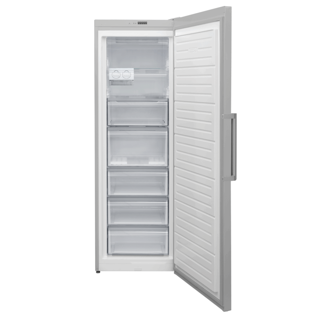 Freezer Heinner HFF-V280NFSF+, Full No Frost, energy efficiency class: F, total capacity: 280L, LED display, electronic control, “Freezer shield” technology (operates at low temperatures - up to -15°C), Super freezing function, 7 compartments, open door alarm, reversible door, freezing capacity: 13kg/24h, dimensions (WxDxH): 59.5 x 65 x 186 cm, color: silver