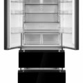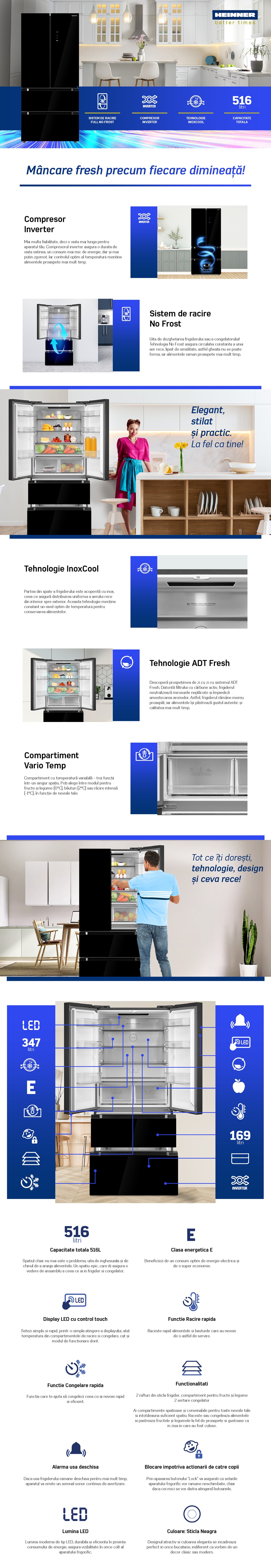 French door combi fridge Heinner HCFD-M516INVHGBKE++, No Frost, Inverter compressor, energy efficiency class: E, total capacity: 516 L, fridge capacity: 347 L, freezer capacity: 169 L, LED display with touch control, InoxCool technology, Super cooling function, Super freezing function, ADT Fresh system, open door alarm, Vario Temp. – variable temperature compartment, 2 fridge glass shelves, crisper drawer, 2 freezer drawers, LED light, freezing capacity: 12kg/24h, dimensions (WxDxH): 83.3 x 65.3 x 189.8 cm, color: Black glass