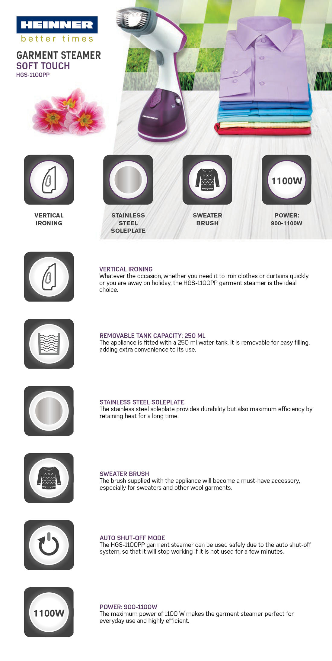 Garment steamer Heinner Soft touch 1100 HGS-1100PP, 1100W, vertical ironing, water tank capacity: 250ml, stainless steel plate, continuous steam action, detachable water tank, brush for sweaters, steam rate: 17±4g/min, purple