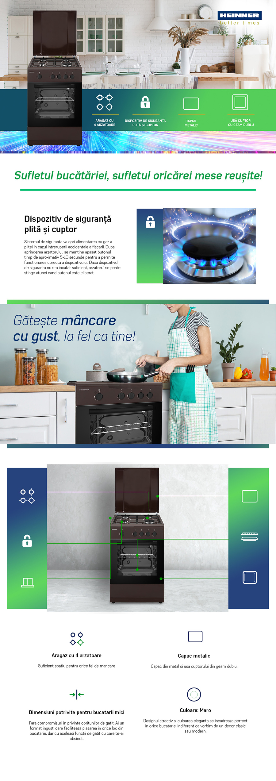 GAS COOKER HEINNER HFSC-SME50BRW, 50X50CM, 4 GAS BURNERS, ENAMEL PAN SUPPORT, METAL LID, GAS SAFETY HOB AND OVEN, DOUBLE GLASS OVEN DOOR, NG SETTLED, SPARE LPG NOZZLES INCLUDED, OVEN TRAY AND GRID, DIMENSIONS (WXDXH): 49.8X50X85 CM, COLOR: BROWN