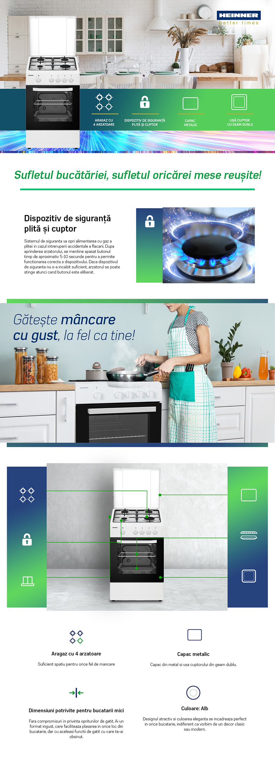 GAS COOKER HEINNER HFSC-SME50WH, 50X50CM, 4 GAS BURNERS, ENAMEL PAN SUPPORT, METAL LID, GAS SAFETY HOB AND OVEN, DOUBLE GLASS OVEN DOOR, NG SETTLED, SPARE LPG NOZZLES INCLUDED, OVEN TRAY AND GRID, DIMENSIONS (WXDXH): 49.8X50X85 CM, COLOR: WHITE
