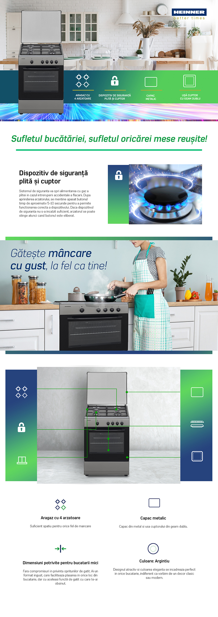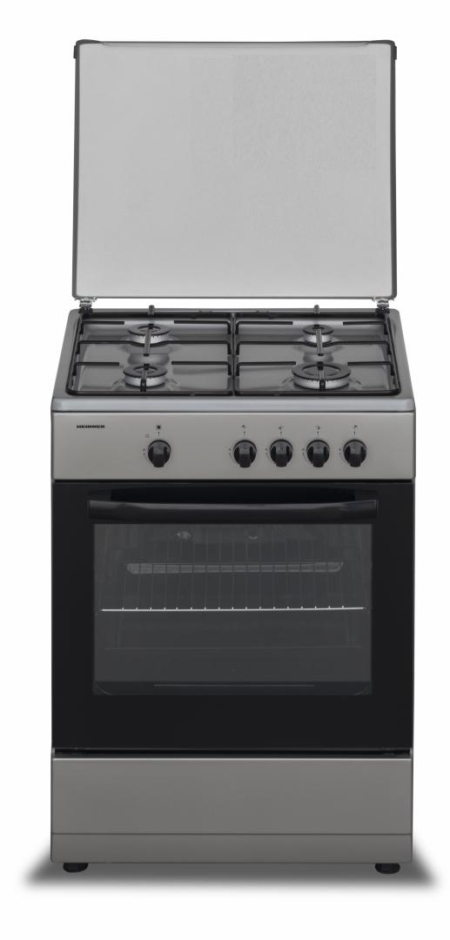 GAS COOKER HEINNER HFSC-SME60SL, 60X55CM, 4 GAS BURNERS, ENAMEL PAN SUPPORT, METAL LID, GAS SAFETY HOB AND OVEN, DOUBLE GLASS OVEN DOOR, NG SETTLED, SPARE LPG NOZZLES INCLUDED, OVEN TRAY AND GRID, DIMENSIONS (WXDXH): 60X55X85 CM, COLOR: SILVER