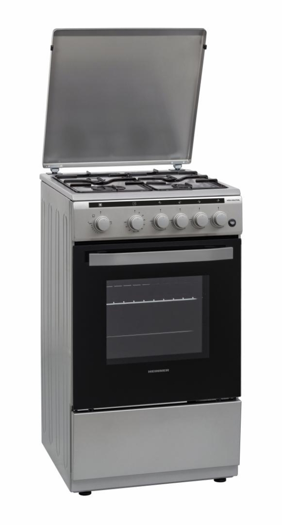 Gas cooker Heinner HFSC-V50LITSL, 50x50cm, 4 Gas burners, Enamel pan support, Metal lid, Auto ignition, Gas safety hob and oven, Timer, Grill, Interior oven light, Removable double glass oven door, NG settled, Spare LPG nozzles included, Oven tray and grid, Dimensions (WxDxH): 50x50x85 cm, Color: Silver