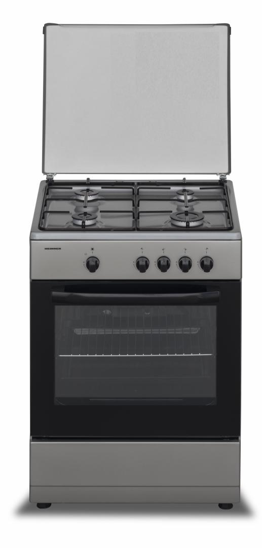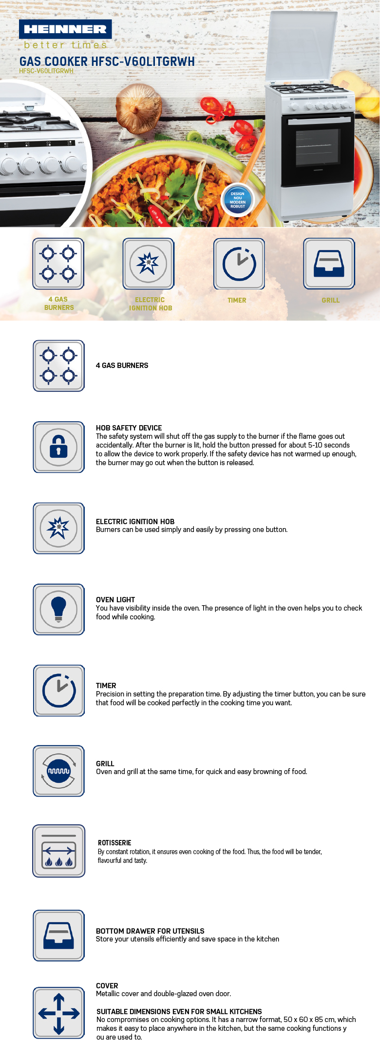 Gas cooker Heinner HFSC-V60LITGRWH, 50x60cm, 4 Gas burners, Enamel pan support, Metal lid, Auto ignition, Gas safety hob and oven, Timer, Grill, Turnspit, Interior oven light, Removable double glass oven door, NG settled, Spare LPG nozzles included, Oven tray and grid, Dimensions (WxDxH): 50x60x85 cm, Color: White