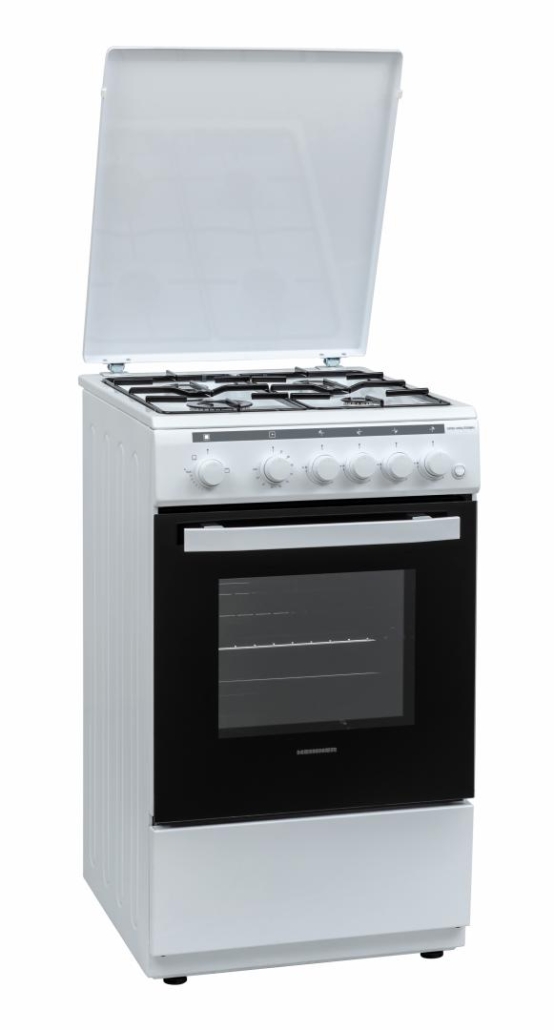 Gas cooker Heinner HFSC-V60LITGRWH, 50x60cm, 4 Gas burners, Enamel pan support, Metal lid, Auto ignition, Gas safety hob and oven, Timer, Grill, Turnspit, Interior oven light, Removable double glass oven door, NG settled, Spare LPG nozzles included, Oven tray and grid, Dimensions (WxDxH): 50x60x85 cm, Color: White