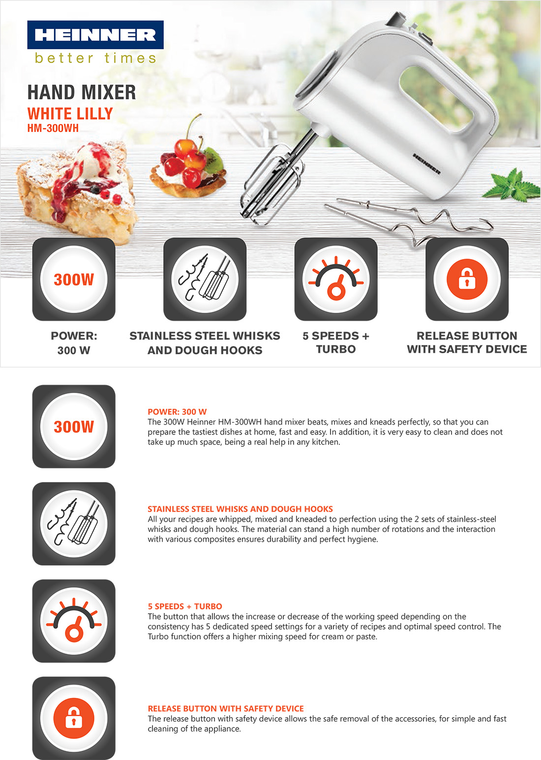 Hand mixer Heinner White Lilly HM-300WH, 300W, stainless steel dough hooks and beaters, 5