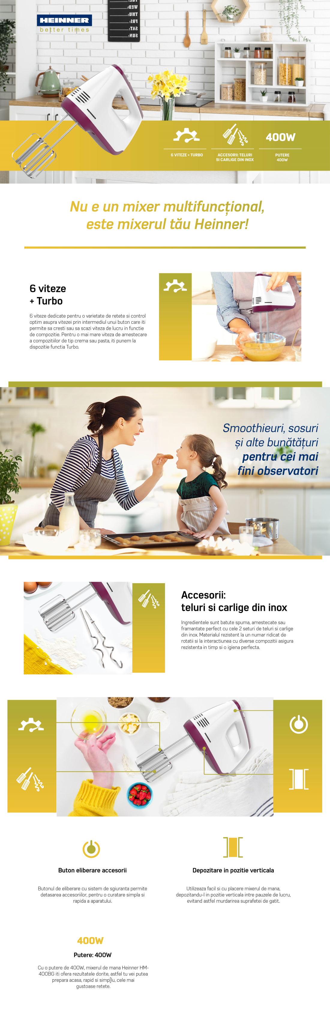 Hand mixer HEINNER HM-400BG, power: 400W, stainless steel dough hooks and beaters, 6 speed