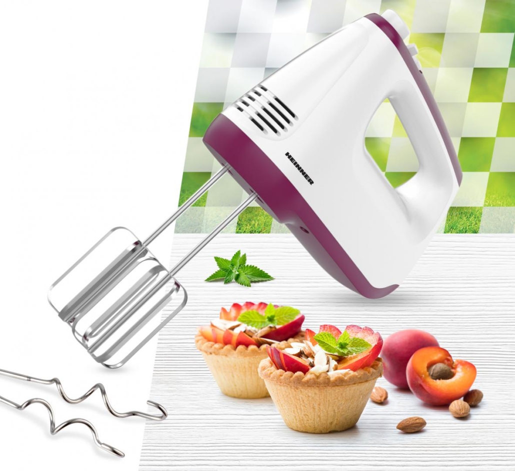 Hand mixer HEINNER HM-400BG, power: 400W, stainless steel dough hooks and beaters, 6 speeds + TURBO, self stand, white + burgundy