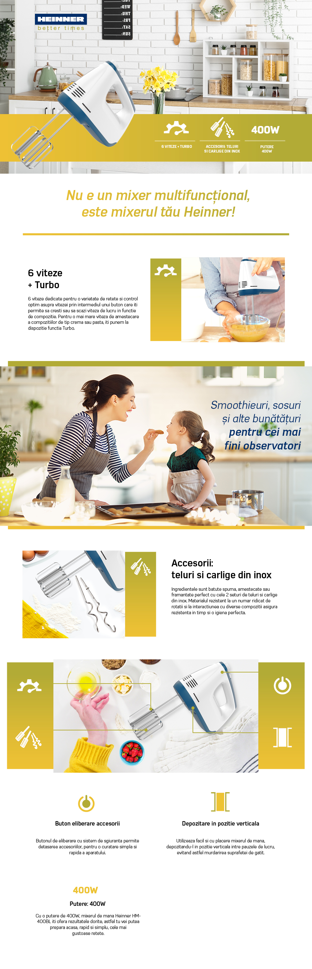HAND MIXER HEINNER HM-400BL, POWER: 400W, STAINLESS STEEL DOUGH HOOKS AND BEATERS, 6 SPEED