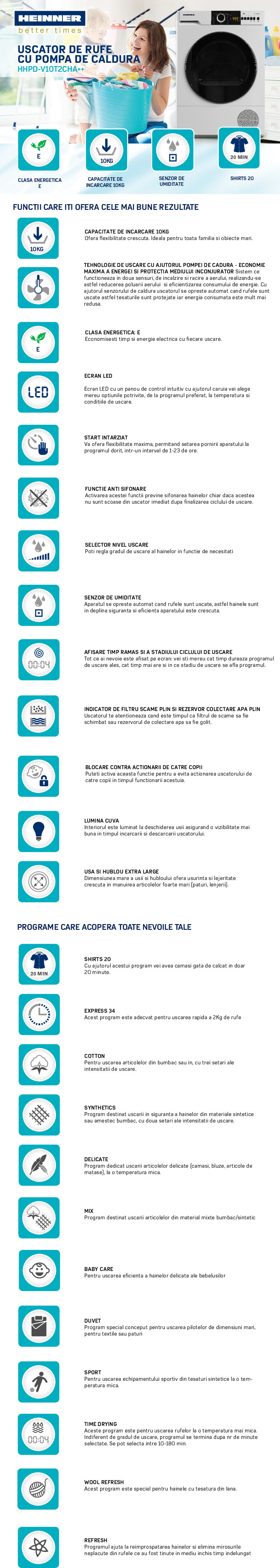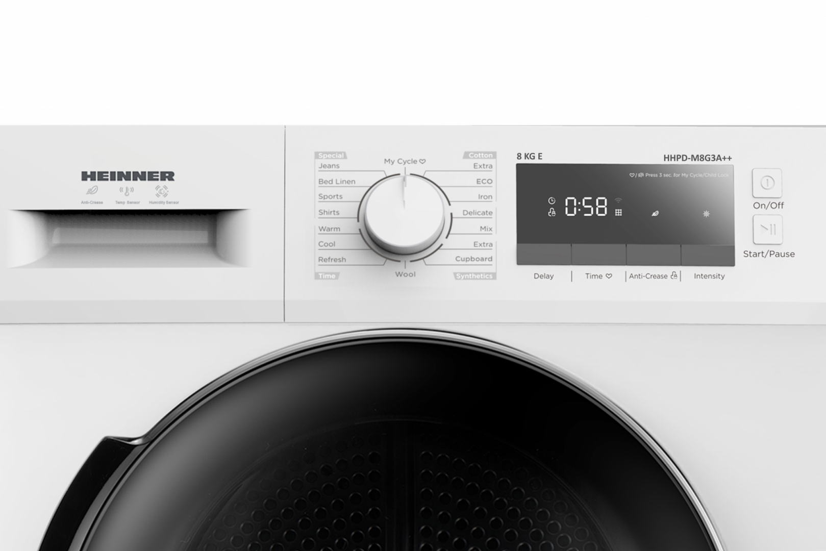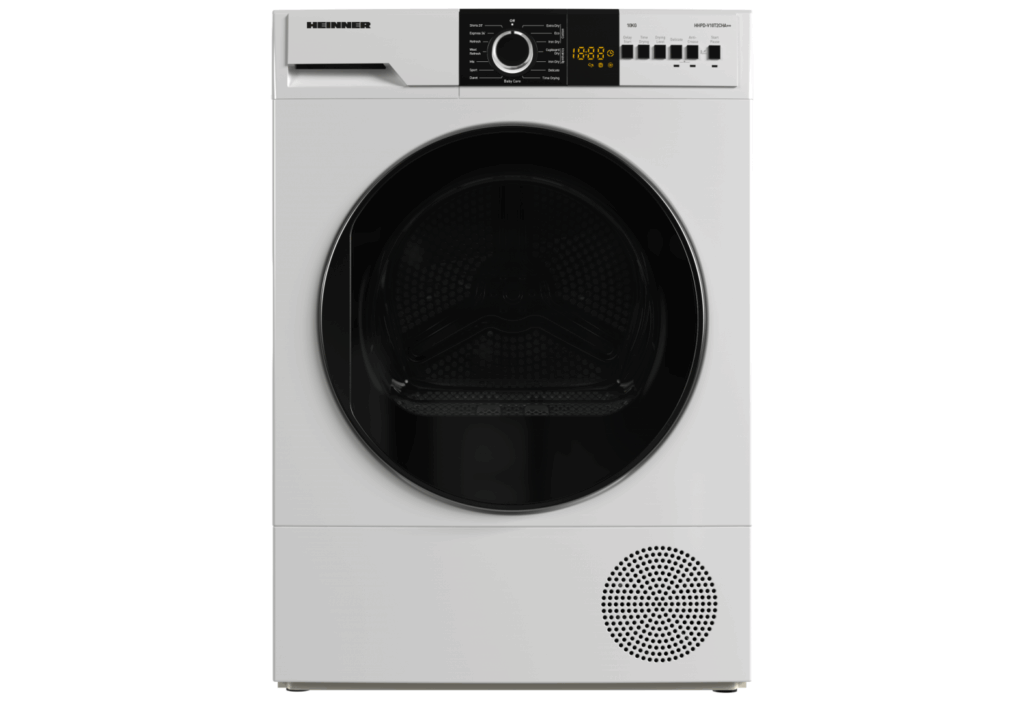 HEAT PUMP DRYER HEINNER HHPD-V10T2CHA++, LOADING CAPACITY 10KG, ENERGY EFFICIENCY CLASS A++, 15 DRYING PROGRAMS, LED DISPLAY, SHIRTS 20 MIN, EXPRES 34 MIN, BABY CARE PROGRAM, DELAY START, ANTI-CREASE FUNCTION, DRUM LIGHT, DRYING LEVEL SELECTION, LINT FILTER INDICATOR, WATER TANK FULL INDICATOR, CHILD LOCK, DIMENSIONS (WXDXH): 59.6X63.9X84.5 CM, COLOR: WHITE