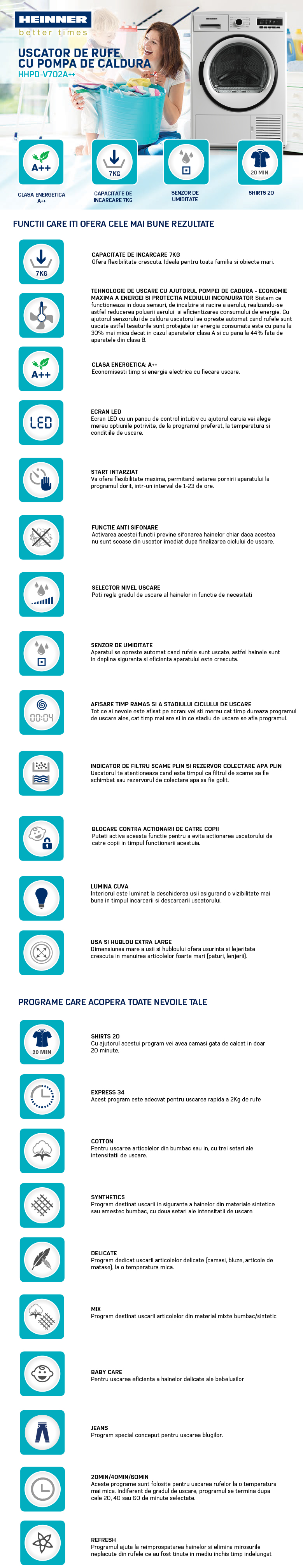 HEAT PUMP DRYER HEINNER HHPD-V702A++, LOADING CAPACITY 7KG, ENERGY EFFICIENCY CLASS A++, 15 DRYING PROGRAMS, LED DISPLAY, SHIRTS 20 MIN, EXPRES 34 MIN, BABY CARE PROGRAM, DELAY START, ANTI-CREASE FUNCTION, DRUM LIGHT, DRYING LEVEL SELECTION, LINT FILTER INDICATOR, WATER TANK FULL INDICATOR, CHILD LOCK, DIMENSIONS (WXDXH): 59.6 X 56.3X84.5 CM, COLOR: WHITE