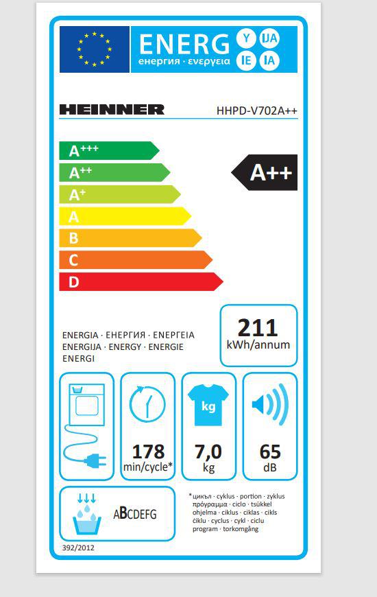 HEAT PUMP DRYER HEINNER HHPD-V702A++, LOADING CAPACITY 7KG, ENERGY EFFICIENCY CLASS A++, 15 DRYING PROGRAMS, LED DISPLAY, SHIRTS 20 MIN, EXPRES 34 MIN, BABY CARE PROGRAM, DELAY START, ANTI-CREASE FUNCTION, DRUM LIGHT, DRYING LEVEL SELECTION, LINT FILTER INDICATOR, WATER TANK FULL INDICATOR, CHILD LOCK, DIMENSIONS (WXDXH): 59.6 X 56.3X84.5 CM, COLOR: WHITE