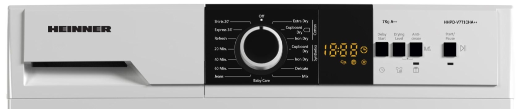 HEAT PUMP DRYER HEINNER HHPD-V7T1CHA++, LOADING CAPACITY 7KG, ENERGY EFFICIENCY CLASS A++, 15 DRYING PROGRAMS, LED DISPLAY, SHIRTS 20 MIN, EXPRES 34 MIN, BABY CARE PROGRAM, DELAY START, ANTI-CREASE FUNCTION, DRUM LIGHT, DRYING LEVEL SELECTION, LINT FILTER INDICATOR, WATER TANK FULL INDICATOR, CHILD LOCK, DIMENSIONS (WXDXH): 59.6 X 52.5X84.5 CM, COLOR: WHITE