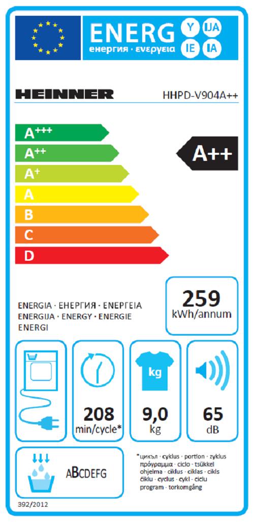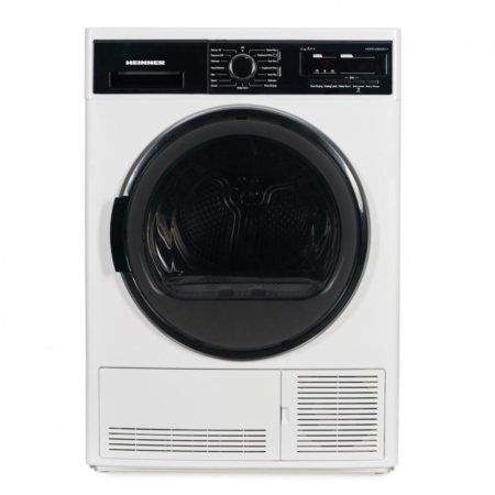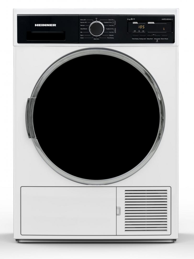 Heat pump dryer Heinner HCD-V904A++, Loading capacity 9kg, Energy efficiency class A++, 15 drying programs, Elegant design with black panel and chromed door, LED display, Shirts 20 min, Expres 34 min, Baby care program, Delay start, Anti-crease function, Drum light, Drying level selection, Lint filter indicator, Water tank full indicator, Child lock, Dimensions (WxDxH): 59.6x60.9x84.5 cm, Color: White