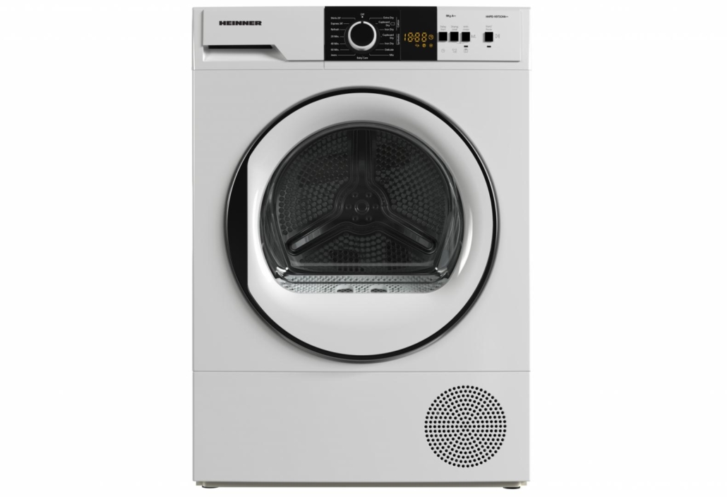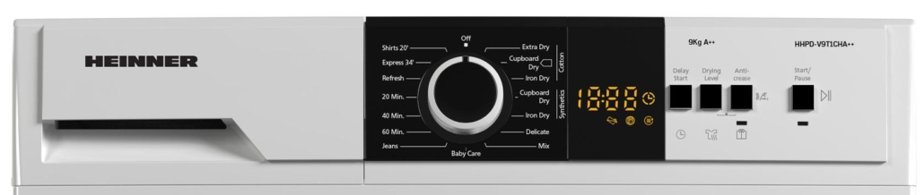 HEAT PUMP DRYER HEINNER HHPD-V9T1CHA++, LOADING CAPACITY 9KG, ENERGY EFFICIENCY CLASS A++, 15 DRYING PROGRAMS, LED DISPLAY, SHIRTS 20 MIN, EXPRES 34 MIN, BABY CARE PROGRAM, DELAY START, ANTI-CREASE FUNCTION, DRUM LIGHT, DRYING LEVEL SELECTION, LINT FILTER INDICATOR, WATER TANK FULL INDICATOR, CHILD LOCK, DIMENSIONS (WXDXH): 59.6 X 60.9X84.5 CM, COLOR: WHITE