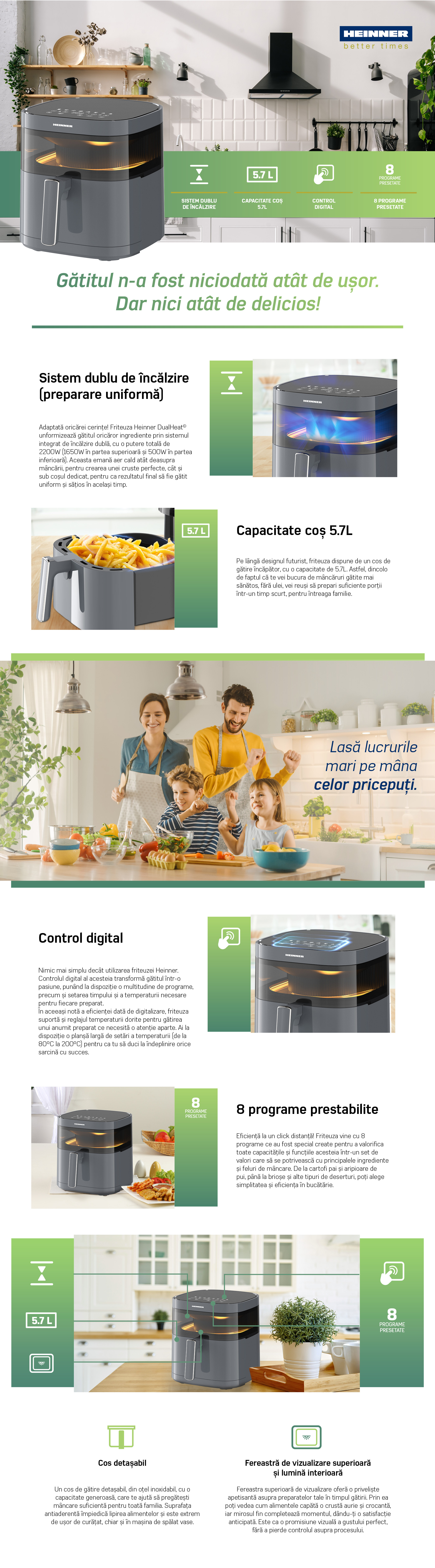 HOT AIR FRYER HEINNER DualHeat HAF-B6GRY17LG, POWER: 1700W, BASKET CAPACITY: 5.7L, DIGITAL DISPLAY, DUAL HEATING TECHNOLOGY, METAL CAVITY, TEMPERATURE: 80-200°C, TIMER: 60MIN, 8 PRESET PROGRAMS, DETACHABLE BASKET, SEE-THROUGH WINDOW, INTERNAL LIGHT, AUTO-OFF, GREY