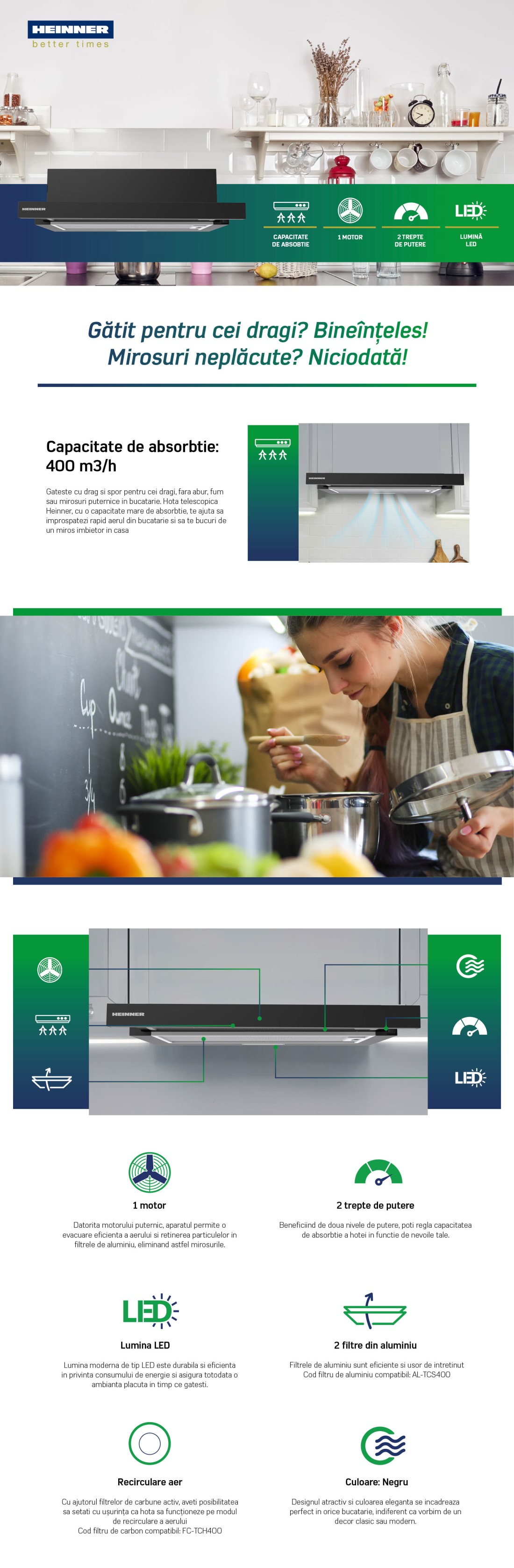 HOTA TELESCOPICA HEINNER HTCH-MD400BK, 60CM, PUTERE MAXIMA DE ABSORBTIE: 400 M3/H, 2 TREPTE DE VITEZA, MOTOR: 1 X 45W, LUMINA LED: 1 X 1.5W, 2 FILTRE ALUMINIU, DIAMETRU TUB DE EVACUARE: 150 MM, DIMENSIUNI (LXAXI): 59.5X30.8X17.5 CM, CULOARE: NEGRU