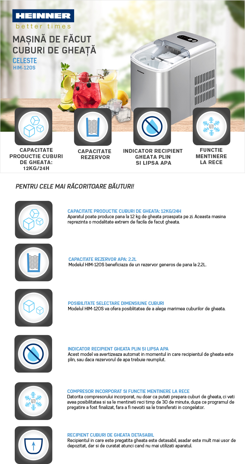 Ice cube maker Heinner Celeste 120 HIM-120S, Daily ice output: 12kg/24H, One cycle capacity: 9 ice cubes/7-11 min, Water tank capacity: 2.1L, Two ice cubes dimensions, Removable ice basket, Large transparent full-view window, Full ice basket indicator, Low water indicator, Power: 120W, Dimensions (WxDxH): 24.4x37.3x31.5 cm, Color: Silver