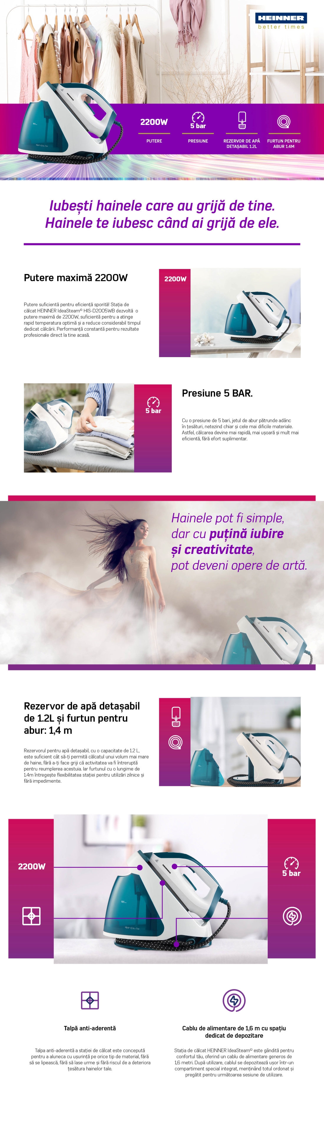 IRON STATION HEINNER IdeaSteam HIS-D2005WB, MAX POWER: 2200W, PRESSURE: 5 BAR, DETACHABLE WATER TANK: 1.2L, 4 HEATING SETTINGS, STEAM: 50±10 g/min, CABLE STORAGE, NON-STICK IRON SOLEPLATE, COLOR: WHITE & BLUE