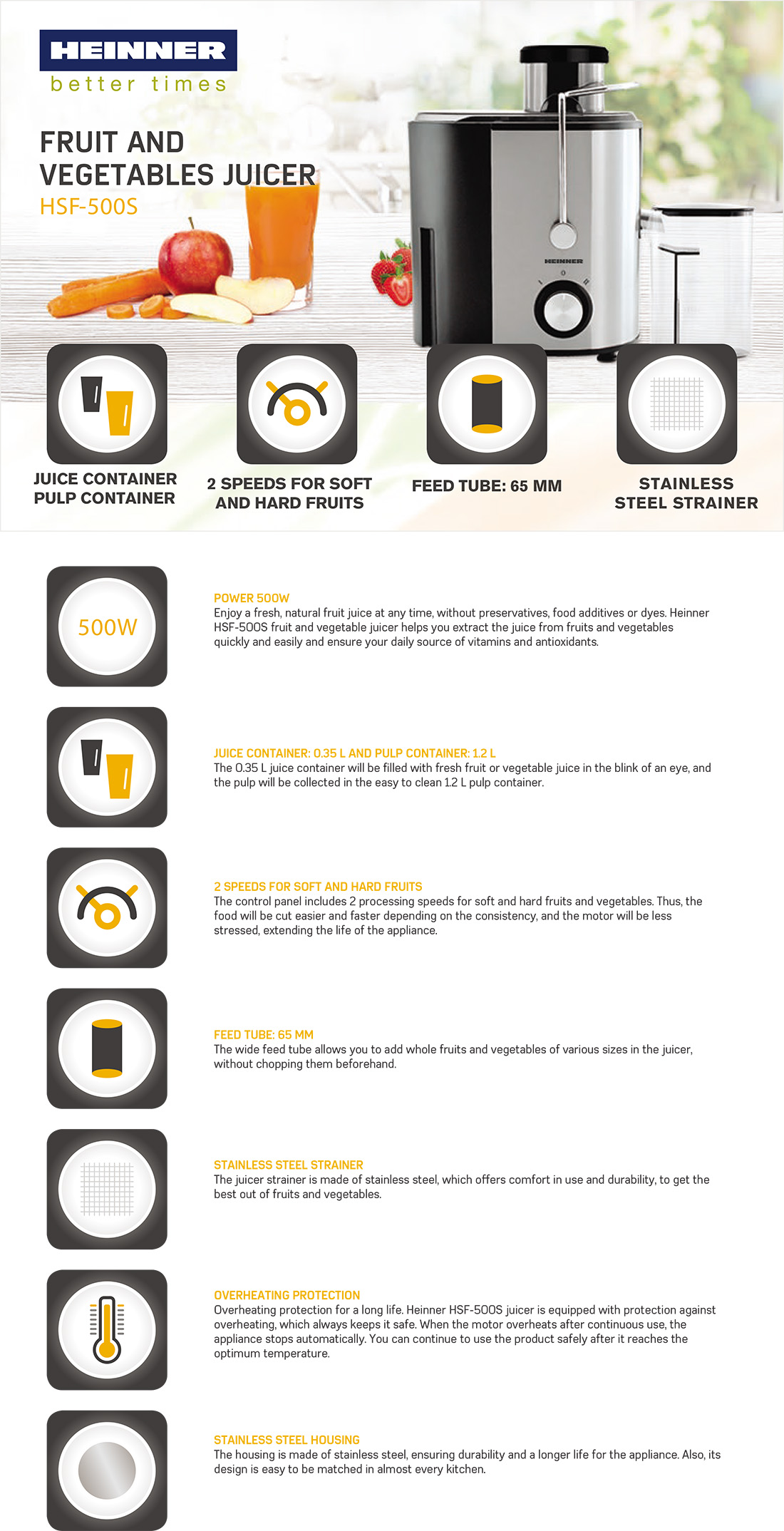 Juice extractor HSF-500S, 500W, large feeding tube 65mm, pulp bin: 1.2 l, juice jug: 350ml, stainless steel filter, 2 speeds, overheat protection, safety lock, stainless steel