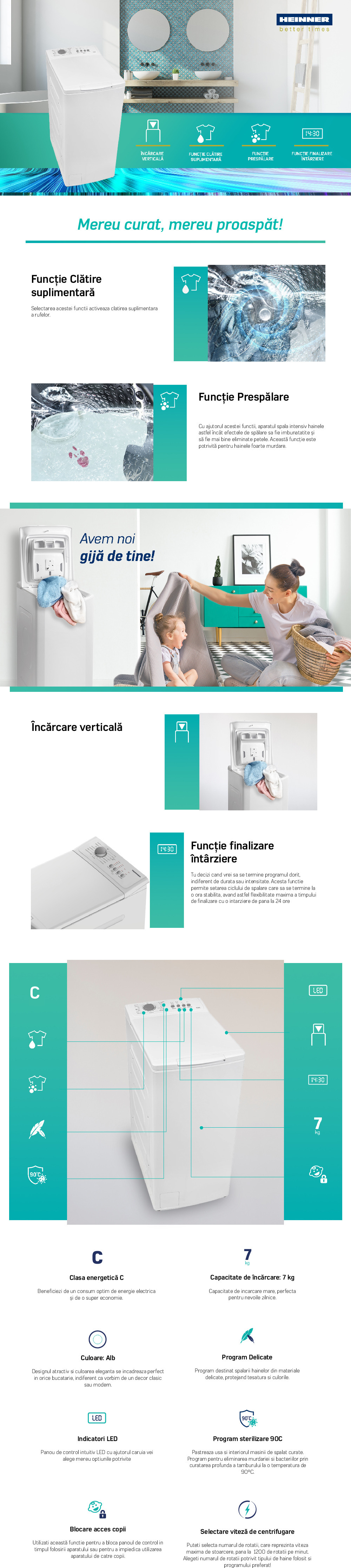 MASINA DE SPALAT RUFE CU INCARCARE VERTICALA HEINNER HWM-TL7012C++, CAPACITATE 7KG, VITEZA DE CENTRIFUGARE 1200RPM, CLASA ENERGETICA C, 15 PROGRAME, DISPLAY LED, PROGRAM RAPID 15MIN, PROGRAM SCURT 45MIN, PROGRAM HYGIENE 90°C, PROGRAM DELICATE, CLATIRE SUPLIMENTARA, PRESPALARE, FUNCTIE INTARZIERE FINALIZARE, SELECTOR VITEZA DE CENTRIFUGARE, BLOCARE ACCES COPII, DIMENSIUNI ( LXAXI): 40X61X87.5 CM, CULOARE ALB