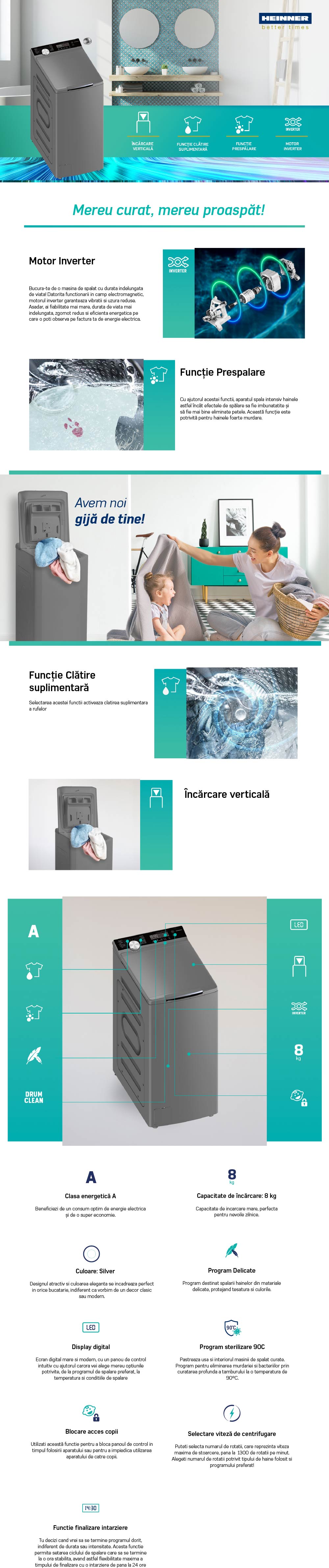 MASINA DE SPALAT RUFE CU INCARCARE VERTICALA HEINNER HWM-TL8013IVKSA+++, CAPACITATE 8KG, VITEZA DE CENTRIFUGARE 1300RPM, CLASA ENERGETICA A, MOTOR INVERTER, 15 PROGRAME, CONTROL TOUCH, PROGRAM RAPID 15MIN, PROGRAM SCURT 45MIN, PROGRAM BABY CARE, PROGRAM IGIENIZARE CUVA, CLATIRE SUPLIMENTARA, PRESPALARE, FUNCTIE START INTARZIAT, SELECTOR TEMPERATURA, SELECTOR VITEZA DE CENTRIFUGARE, BLOCARE ACCES COPII, DIMENSIUNI ( LXAXI): 40X61X87.5 CM, CLUOARE SILVER