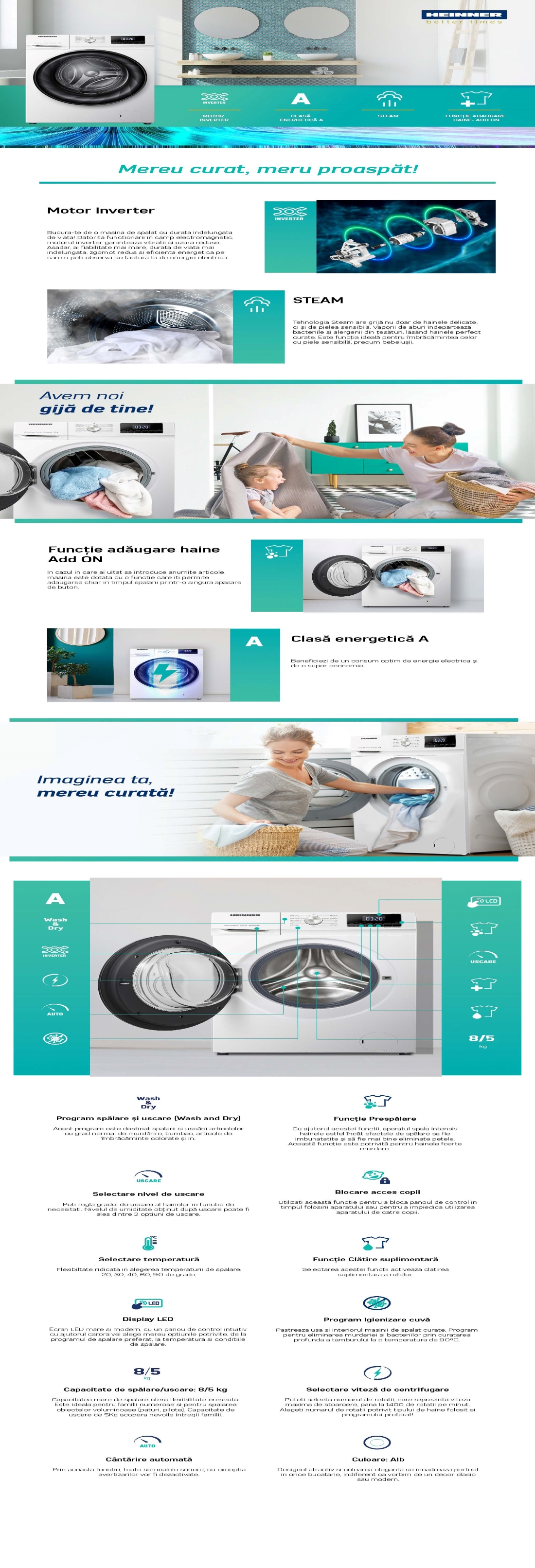 MASINA DE SPALAT RUFE CU USCATOR HEINNER HWDM-H8514A, CAPACITATE DE SPALARE 8KG, CAPACITATE DE USCARE 5KG, VITEZA DE CENTRIFUGARE 1400RPM, CLASA ENERGETICA A, MOTOR INVERTER, 15 PROGRAME, DISPLAY LED, PROGRAM RAPID 15 MIN, PROGRAM SPALARE SI USCARE, PROGRAM ALLERGY STEAM, FUNCTIE INTARZIERE FINALIZARE, CLATIRE SUPLIMENTARA, PRESPALARE, FUNCTIE ADAUGARE RUFE, CANTARIRE AUTOMATA, IGIENIZARE CUVA, SELECTOR TEMPERATURA DE SPALARE, SELECTOR VITEZA CENTRIFUGARE, BLOCARE ACCES COPII, DIMENSIUNI ( LXAXI): 60X54X85 CM, CULOARE: ALB