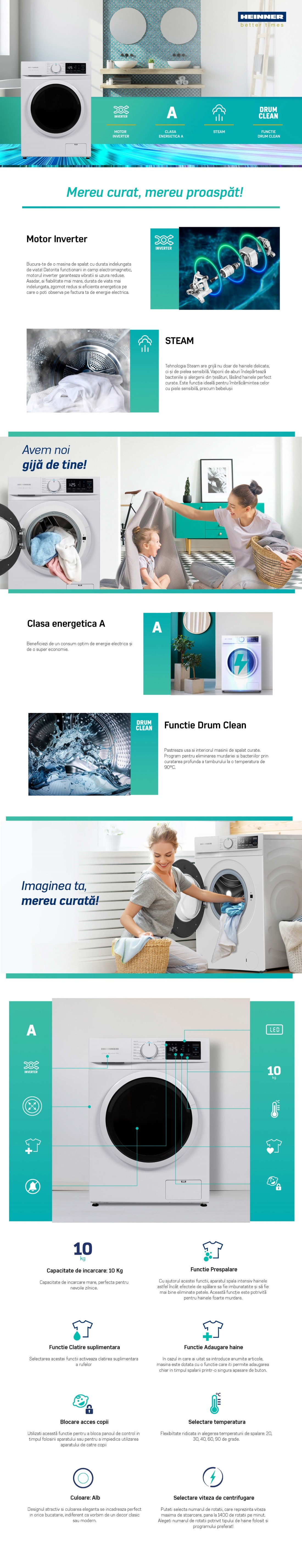 MASINA DE SPALAT RUFE HEINNER HWM-M1014IVNA+++, CAPACITATE 10KG, VITEZA DE CENTRIFUGARE 1400RPM, CLASA ENERGETICA A, MOTOR INVERTER, 15 PROGRAME, DISPLAY DIGITAL, PROGRAM RAPID 15 MIN, PROGRAM STEAM, PROGRAM BABY CARE, CLATIRE SUPLIMENTARA, PRESPALARE, FUNCTIE START INTARZIAT, FUNCTIE IGIENIZARE CUVA, FUNCTIE ADAUGARE RUFE, SELECTOR TEMPERATURA, SELECTOR VITEZA DE CENTRIFUGARE, BLOCARE ACCES COPII, DIMENSIUNI ( LXAXI): 59.5X53X85 CM, CULOARE: ALB