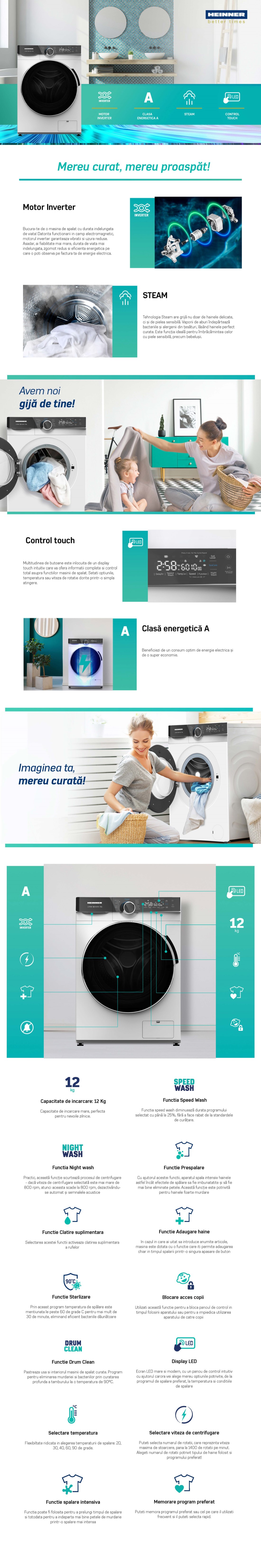 MASINA DE SPALAT RUFE HEINNER HWM-M1214IVKA+++, CAPACITATE 12KG, VITEZA DE CENTRIFUGARE 1400RPM, CLASA ENERGETICA A, MOTOR INVERTER, 14 PROGRAME, CONTROL TOUCH, DISPLAY DIGITAL, PROGRAM RAPID 15 MIN, PROGRAM SPACARE STEAM, PROGRAM BABY CARE, PROGRAM STERILIZARE, CLATIRE SUPLIMENTARA, PRESPALARE, FUNCTIE START INTARZIAT, FUNCTIE SPEED WASH, FUNCTIE ADAUGARE RUFE, MEMORARE PROGRAM PREFERAT, SELECTOR TEMPERATURA, SELECTOR VITEZA DE CENTRIFUGARE, BLOCARE ACCES COPII, DIMENSIUNI ( LXAXI): 59.5X59.5X85 CM, CULOARE: ALB